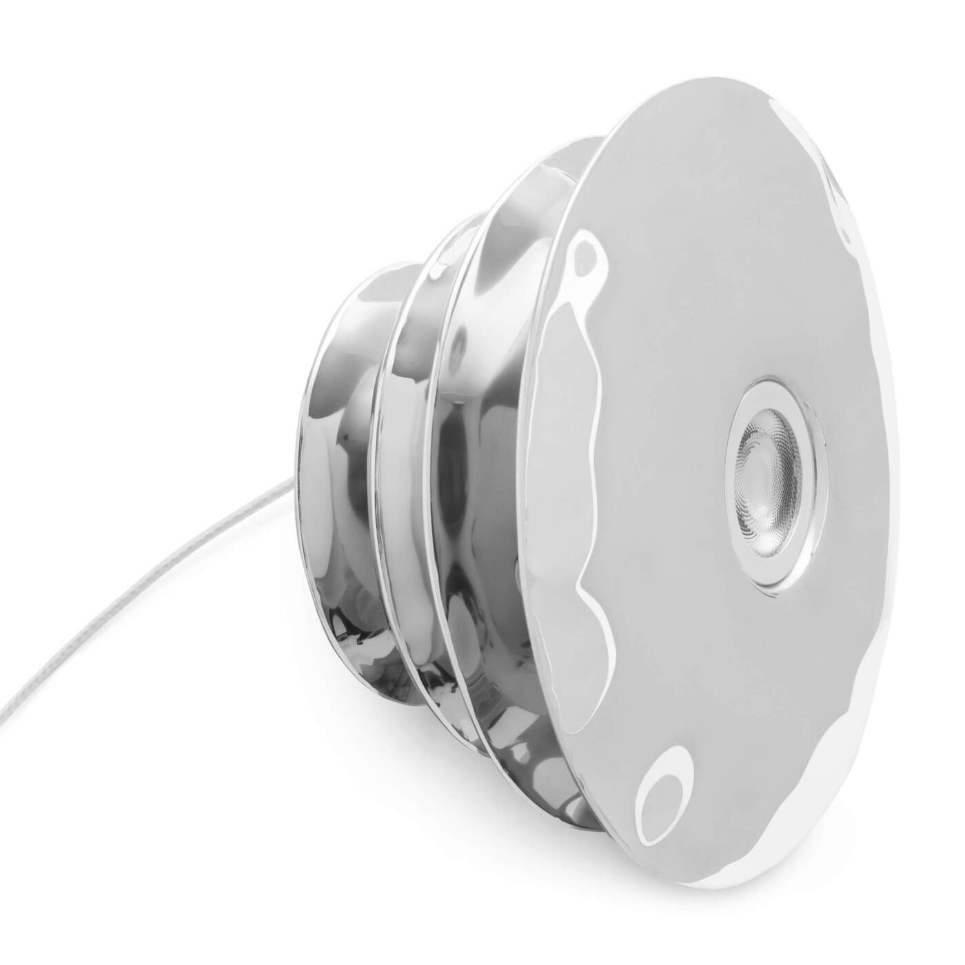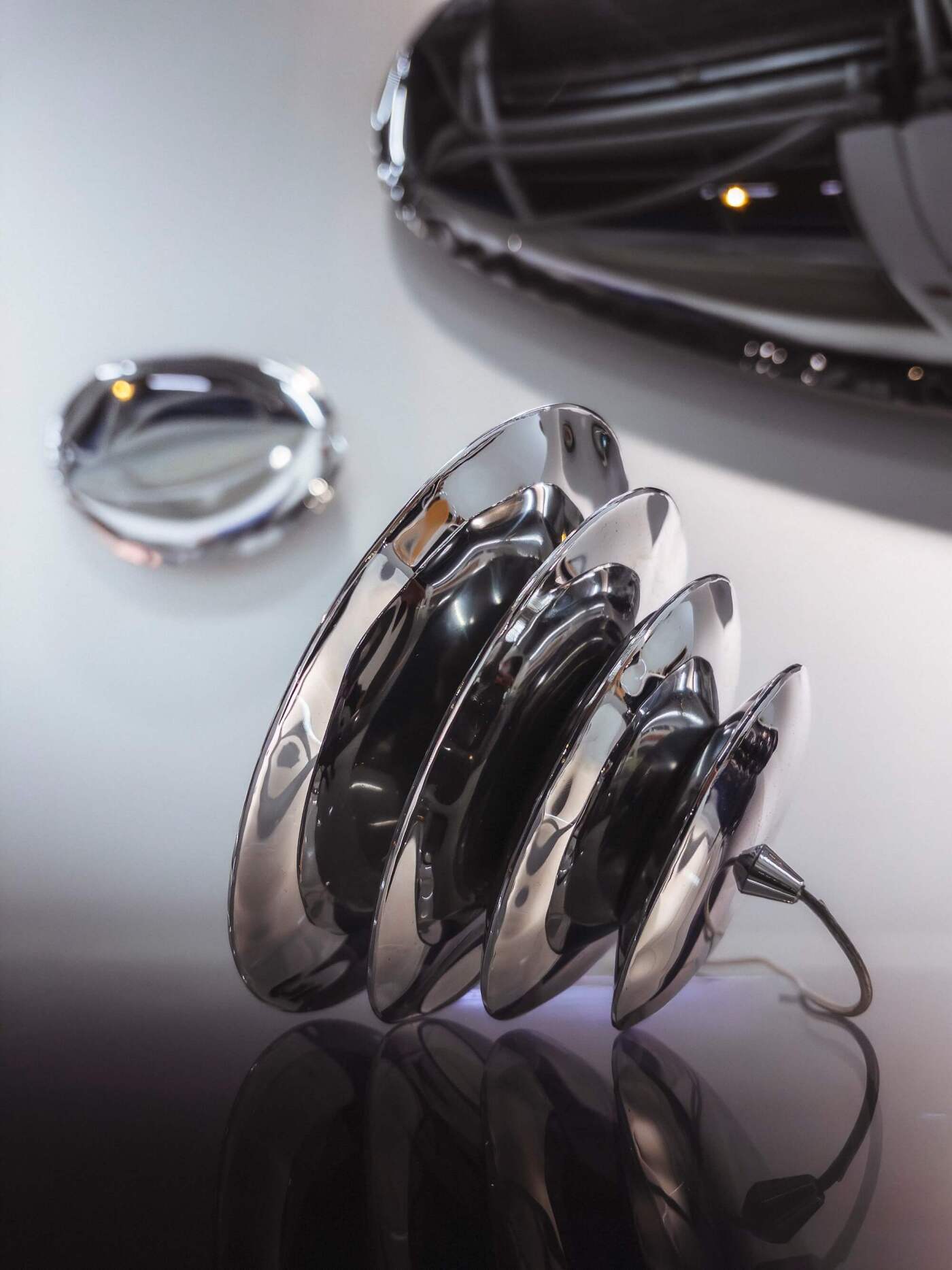 Die Leuchte wird mit der FiDU-Technologie (Freie Innendruck Umformung) gefertigt. Präzise verschweißte Edelstahlbleche werden durch inneren Luftdruck expandiert, wodurch das Material von innen heraus an Volumen gewinnt. Das Ergebnis ist eine dünnwandige und zugleich stabile Struktur, geprägt von rhythmischer Formgebung und subtiler Oberflächenspannung — jedes Stück trägt die Signatur kontrollierter Deformation.