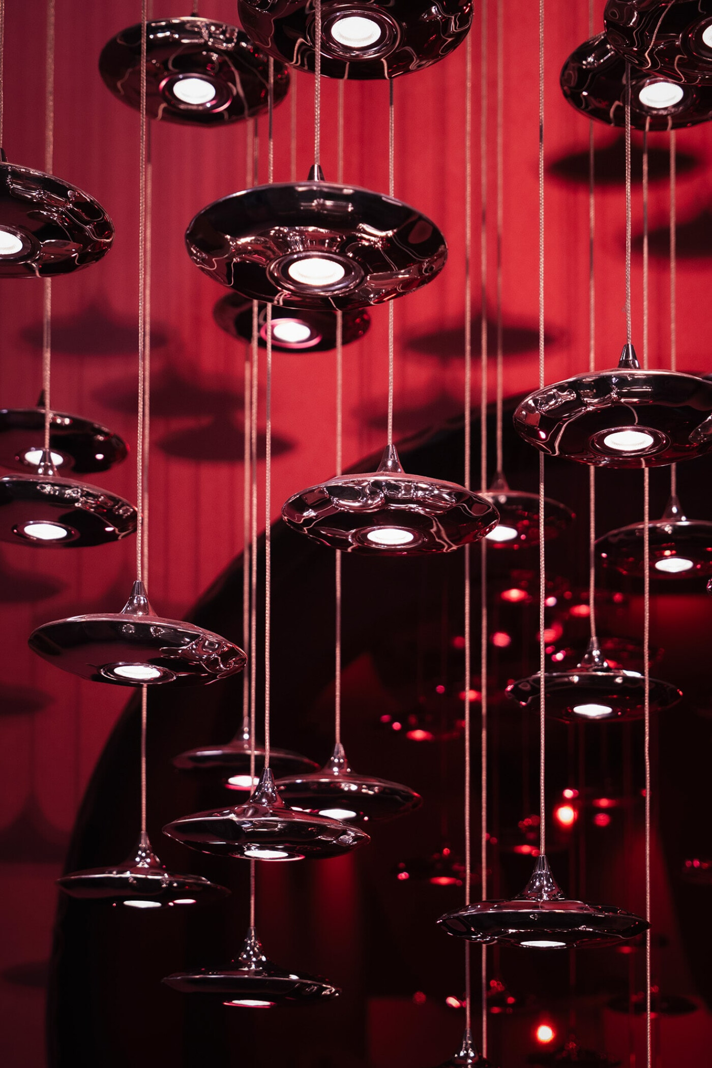 Diese Objekte können als einzelner Akzent im Raum oder als mehrteiliges Set von eleganten, modernen Pendellampen erscheinen. Die Konstellationen von Lampin erschaffen ein lebendiges Bild des Lichts, das sich in den Kantenverformungen der Inox-Leuchten spiegelt. Außer in hochglanzpoliertem Stahl ist Lampin auch in mattem Schwarz oder Weiß sowie in majestätischem Flammengold erhältlich.