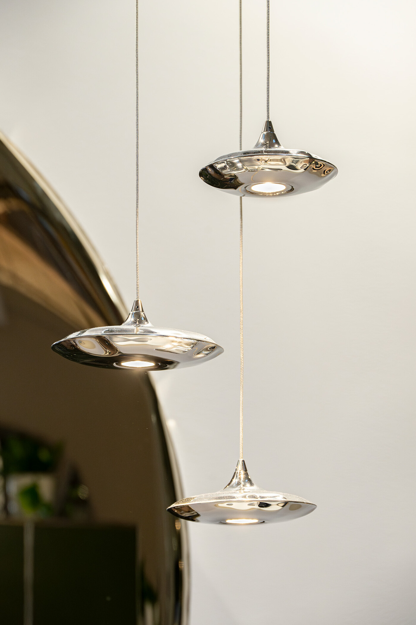 Lampin wird in drei verschiedenen Durchmessern hergestellt: 13, 15 und 17 cm. Für die Zusammensetzung der empfohlenen Sets schlagen wir die Option mit gemischten Größen oder ein Set mit drei gleichen Abmessungen vor, die jedoch nie identisch sind, dank der einzigartigen kantigen Verzerrungen, die für das FiDU-Verformungsverfahren charakteristisch sind. Wir experimentieren gerne mit Metall und sind über die vorgeschlagenen Zusammenstellungen hinaus offen für individuelle Beleuchtungslösungen.