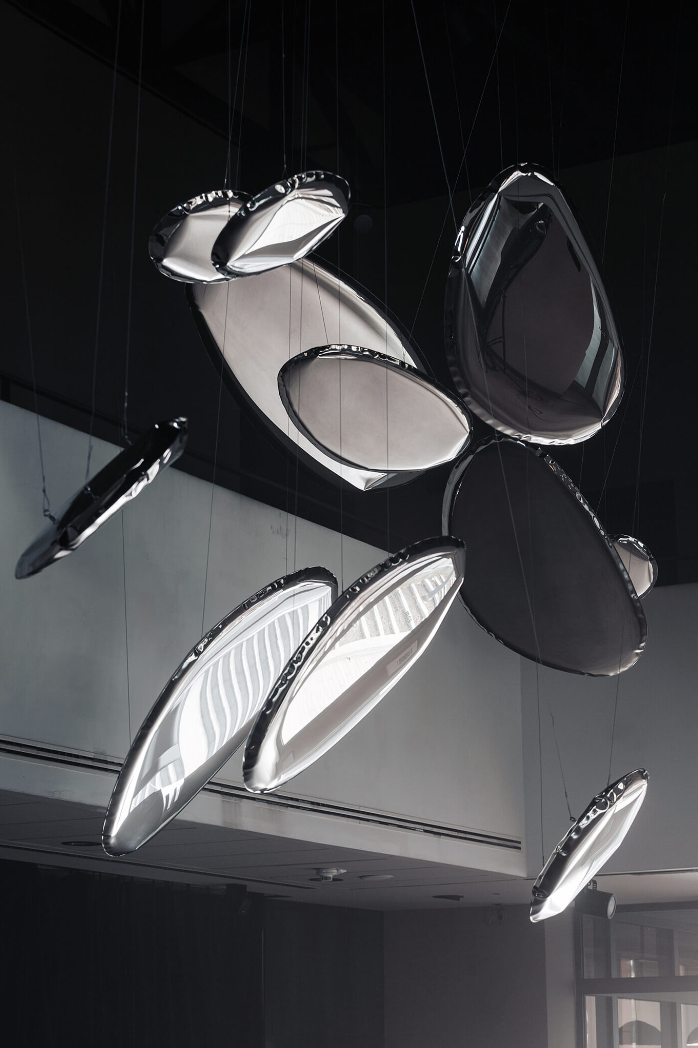 Tafla steel mirrors can be perceived just as that – the mirrors, but they in a way tell a story about the evolution of a drop of water - how it changes its shape - from rounded dew to the angular edges of glacier shelves.