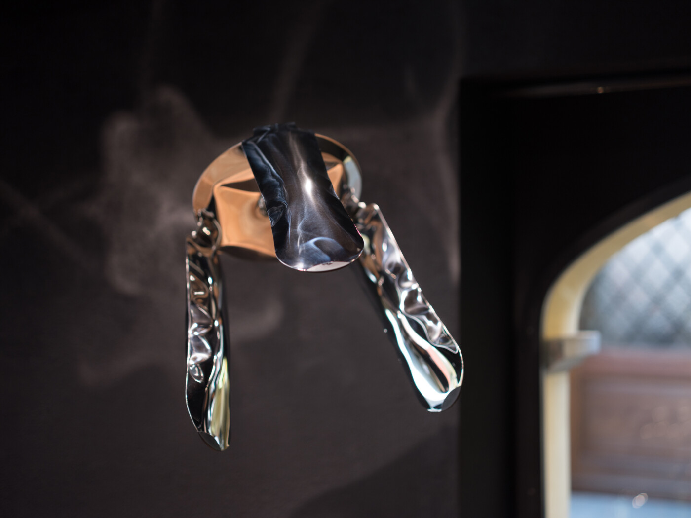 The threads of steel deformations are continued by a constellation of Tafla metal mirrors. These wall objects tell a story about the evolution of a drop of water, and how it changes shape, from rounded dew to the angular edges of glacier shelves.