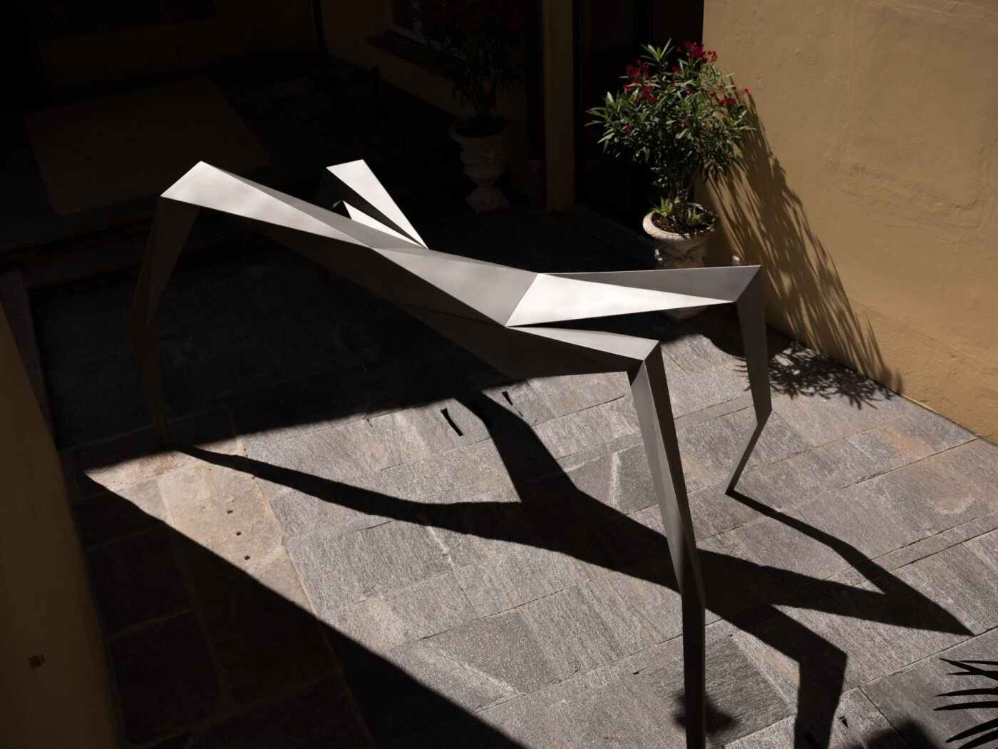 A side, yet distinct and unique thread of the story of deformations is the metal sculpture Anthropod located in the gallery patio. Its geometry contrasts with the warm architecture of the space, and its dynamics deal with the concept of movement suspended in time (human development, science, and technology).