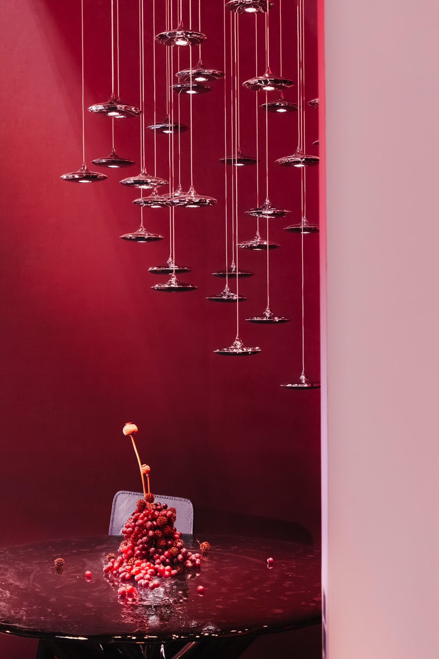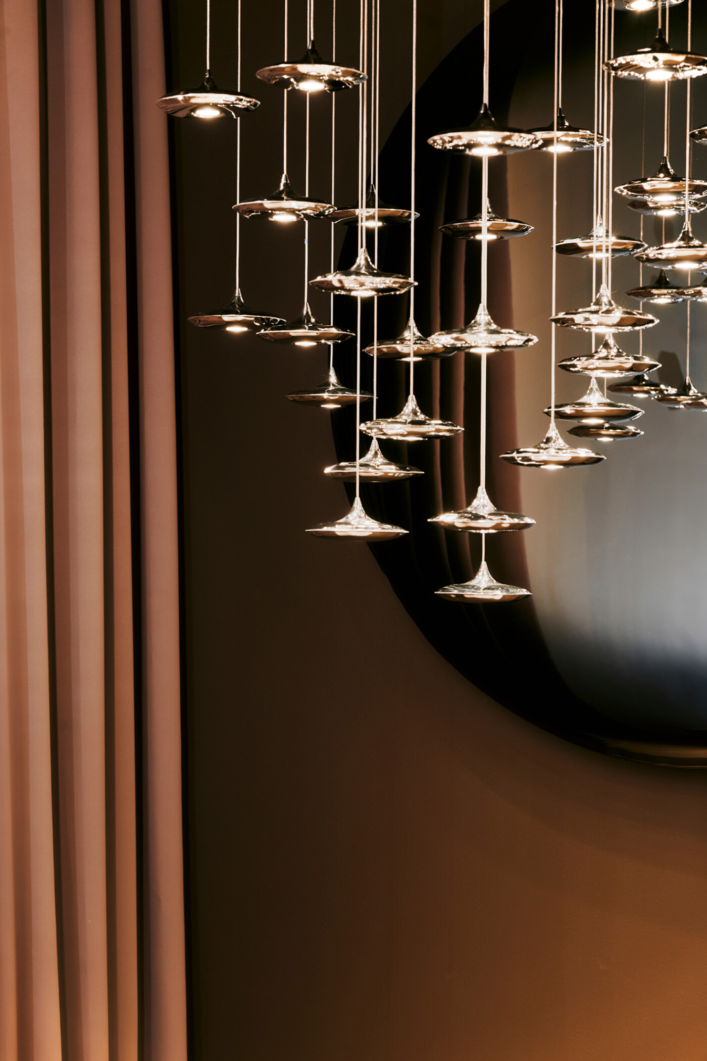 These objects can appear as a single accent in space or as a multi-element set of elegant, modern pendant lamps. Lampin’s constellations create a vivid image of light reflected in the edge deformations of Inox light fixtures. Besides high-gloss polished steel, Lampin is available in matte black or white and majestic flame gold.