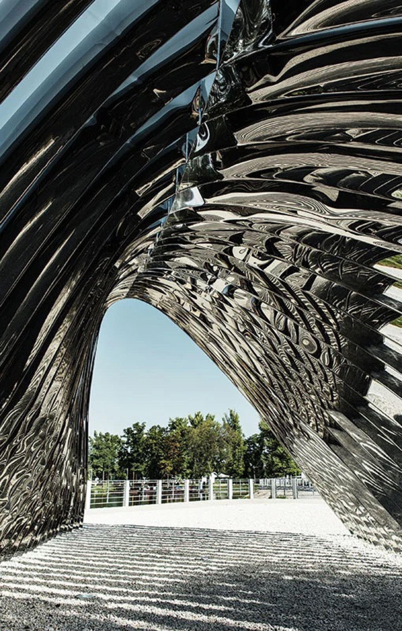 The Tafla mirror is a testament to FiDU technology, showcasing its unlimited structural and architectural potential. By stabilizing metal membranes with internal pressure, this innovative process enables the creation of tailor-made, ultra-light, and sustainable steel structures. FiDU’s "air sculpture" technology represents a forward-thinking and responsible approach to urban space design—an idea Oskar Zięta emphasizes through his public sculptures, such as Nawa and Hempel.