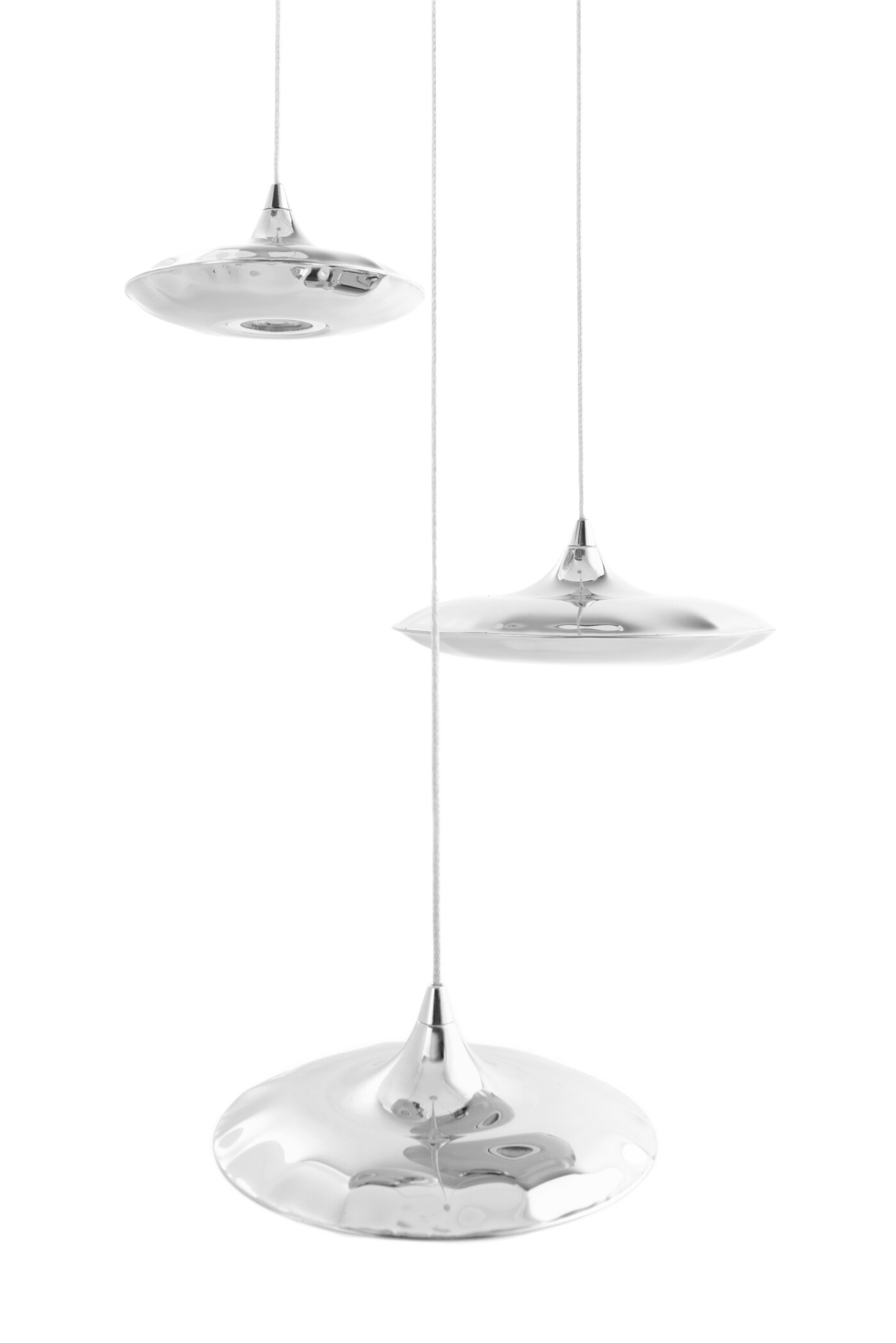 Diese Objekte können als einzelner Akzent im Raum oder als mehrteiliges Set von eleganten, modernen Pendellampen erscheinen. Die Konstellationen von Lampin erschaffen ein lebendiges Bild des Lichts, das sich in den Kantenverformungen der Inox-Leuchten spiegelt. Außer in hochglanzpoliertem Stahl ist Lampin auch in mattem Schwarz oder Weiß sowie in majestätischem Flammengold erhältlich.