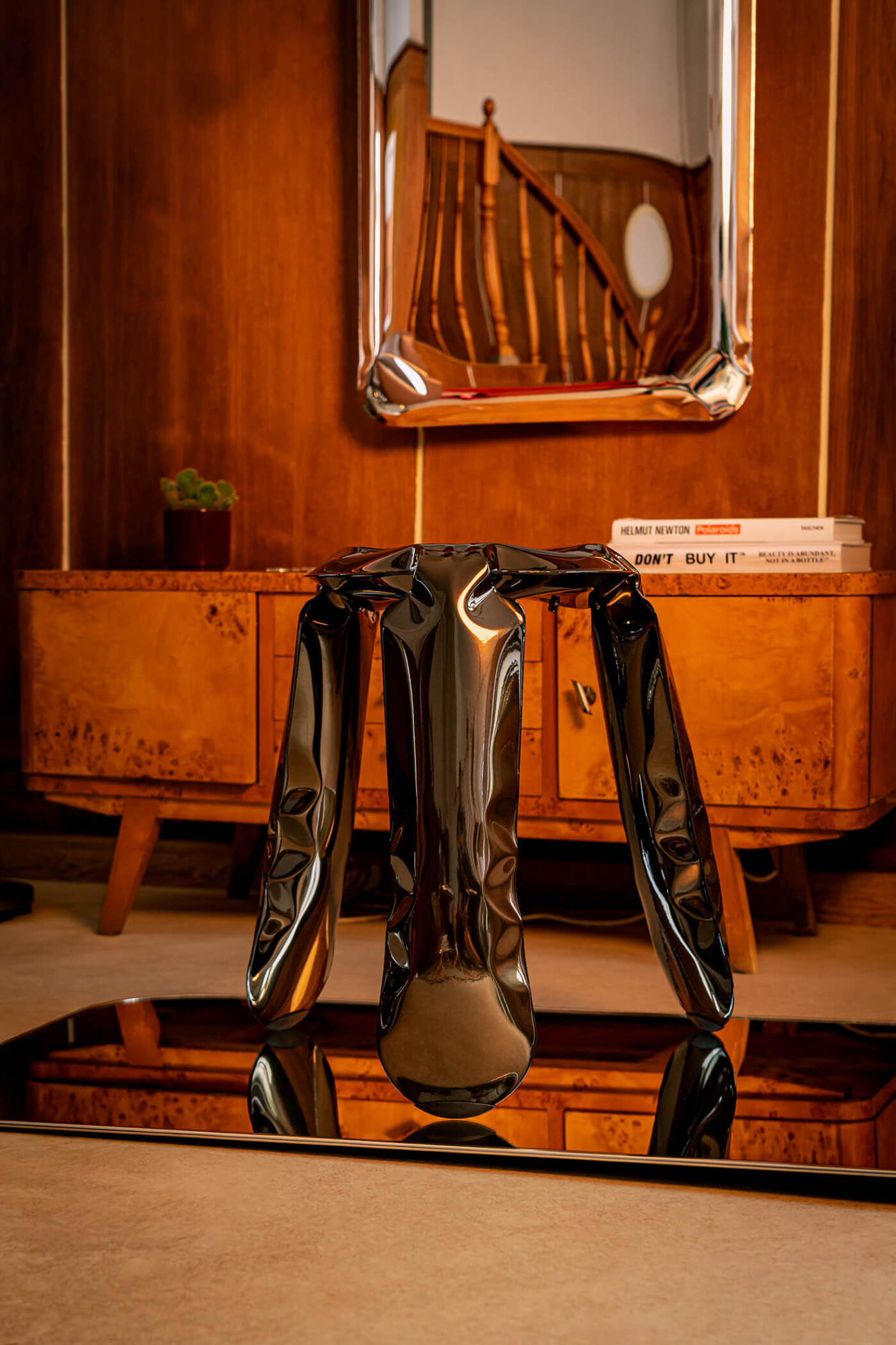 Der Plopp-Hocker aus aufgeblasenem Stahl kann zu 100% recycelt werden, wenn auch mit einem geringfügigen Verlust an Materialqualität. Zweitens ist er langlebig und langlebig - das bedeutet, dass er über Generationen hinweg genutzt werden kann und den Verbrauch auf einem verantwortungsvollen Niveau hält, während Investitionen in Güter nicht so schnell verschwinden. Schließlich die Ultraleichtigkeit - oder die sogenannte Leichtbau-Index-Optimierung, die wortwörtlich Leichtgewichte betrifft - PLOPP ist innen hohl. Und die Leichtigkeit manifestiert sich virtuell. Die FiDU-Technologie ermöglicht die Herstellung aus Stahl, Kupfer oder Aluminium.