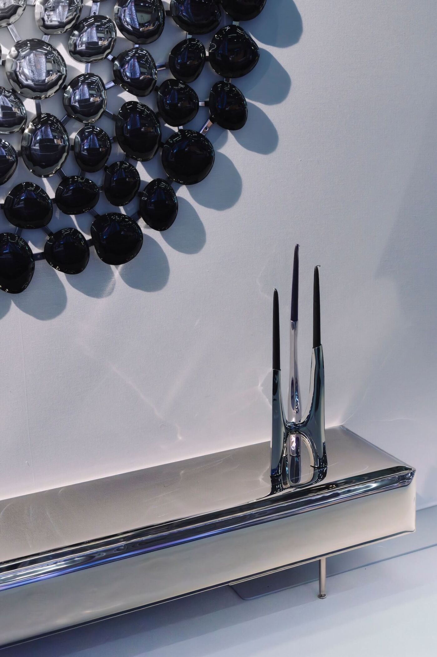 Na stoisku Zieta Studio odwiedzający odkryją szerszą konstelację obiektów ściennych — stalowych klejnotów zaprojektowanych do dialogu ze światłem, przestrzenią i ruchem. Mercury pojawia się jako oniryczna dekoracja ścienna, lustro i współczesny wypukły haut-relief. Obok Mercury prezentowane są Rondo i Oko, a także kroplopodobne lustra Tafla — Tafla O, Tafla C i Tafla Q — będące wyrafinowaną eksploracją refleksu, krzywizny i napięcia materiału.